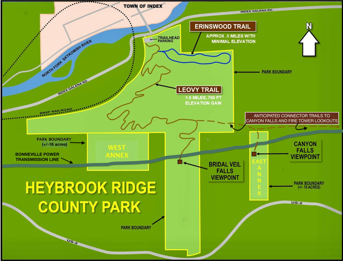 Heybrook Ridge is located just upstream of the confluence of the North and South Forks of the Skykomish River and just southeast of the Town of Index. The Leovy Trail is a popular ~3 mile roundtrip hike offering fantastic vistas, and the Erinswood Trail is a nearly flat ~3/4 mile loop on its way to becoming fully ADA-compliant. Other hikes are in the plans too. Please see the articles below for more information, and our Newsworthy and Events pages for updates.