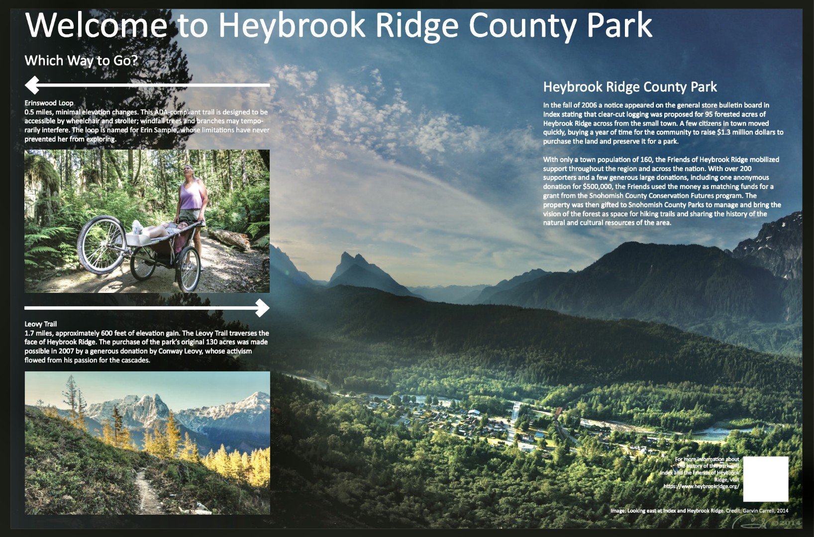 First, a bit of history: In 2006, FOHR was formed with the intent of stopping a huge clearcut operation on the town-side of Heybrook Ridge. We formed a nonprofit and raised $100,000 in under two years, but it was the $500,000 gift from Conway Leovy to FOHR that made it all possible. That led to a $640,000 Snohomish County Conservation Futures grant that enabled the 130-acre purchase to go through (95 acres on the north town-side and 35 on the south highway side). Heybrook Ridge County Park (HRCP) was officially created in September, 2008.