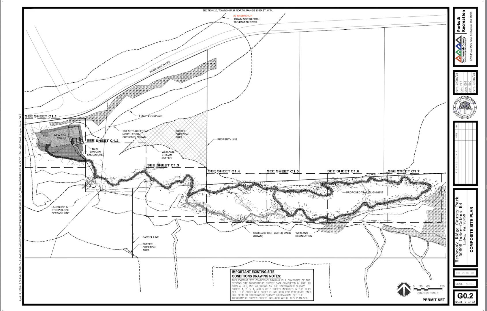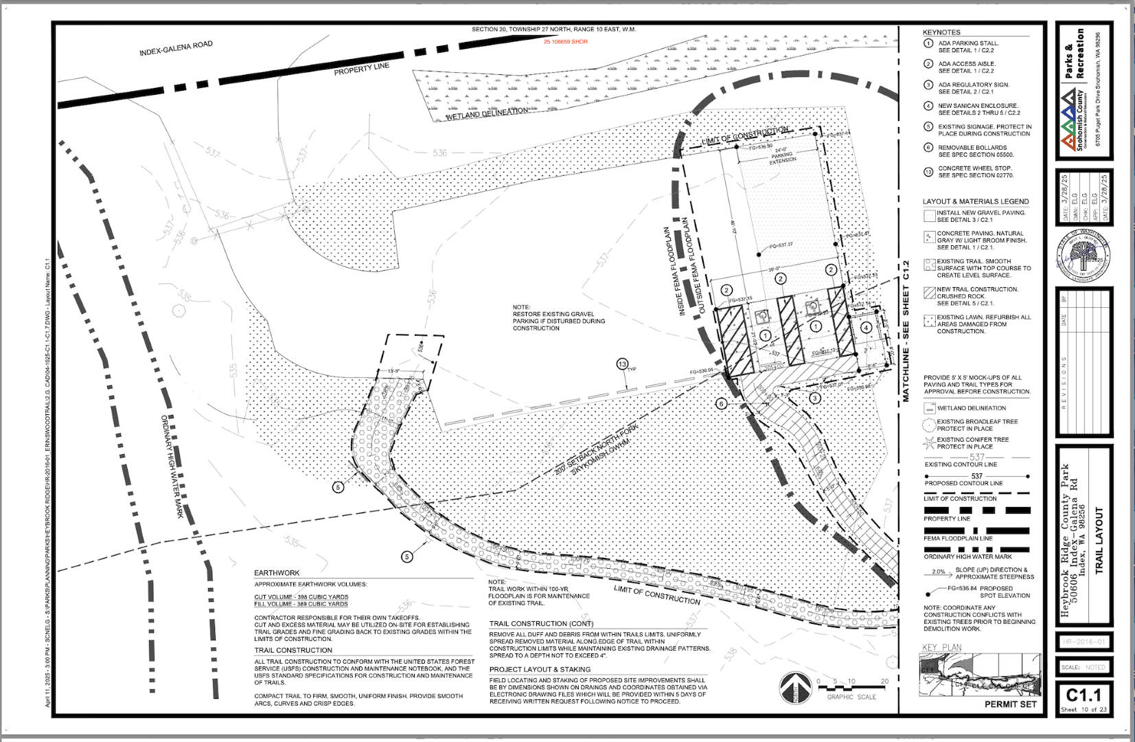 *On Heybrook Ridge County Park's plans to complete the Erinswood Trail and ADA improvements to the parking area: there's good news and fairly good news. The good news is that Heybrook Ridge County Park's trails and parking lot will be open for the rest of this summer. The fairly good news is that Snohomish County Parks and Recreation is still plugging ahead on resolving permitting issues held by the County Planning and Development Services. That step has to be completed before Parks and Rec can reach out for construction bids. Note that the Federal grant for doing this work (awarded in 2021) has been dropped and that the County plans to cover the project's costs, which has created new permitting hoops to jump through. Parks and Rec folks have completed most of them; remaining ones have to do with “geohazards” (basically, landslides from the Ridge onto the trail area) and drainage issues.