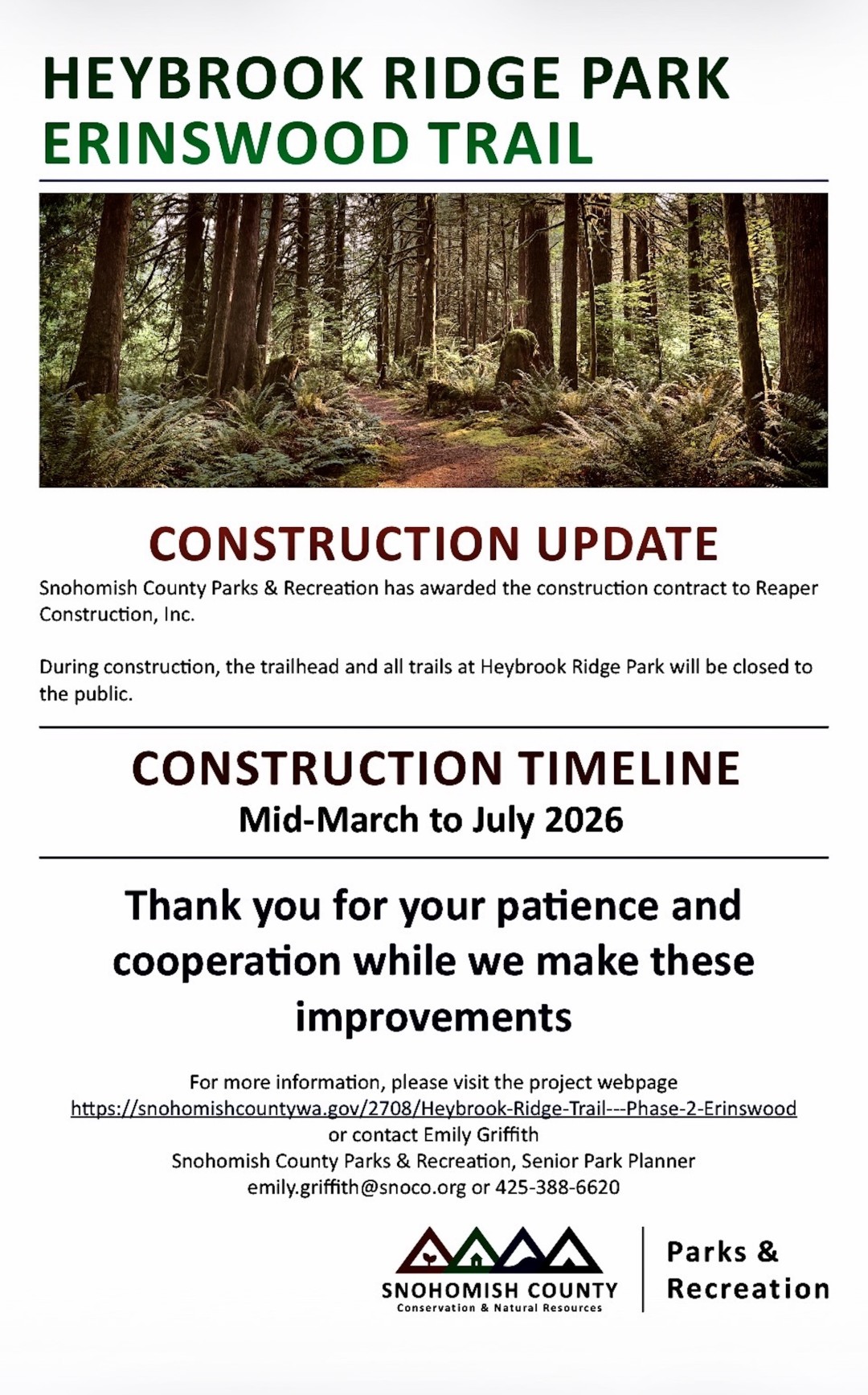 News Flash 2/26/26: SnoCo Parks selected the winning contractor's bid and quickly finalized a contract with Reaper Construction, Inc. As can be seen in the attached announcement, work will begin in mid-March and should be completed by July. Heavy machinery will remain in the parking lot until the project is completed. Due to liability issues and for the public's (and the machines') protection, all of Heybrook Ridge County Park will have to be closed during construction. Note too that even after it opens, accessibility on Erinswood may at times be limited due to broken branches and windfallen trees on the trail. We are now scheming on how to work with the County, WTA and our FOHR webmaster to alert folks who rely on assisted mobility in advance of such constraints.