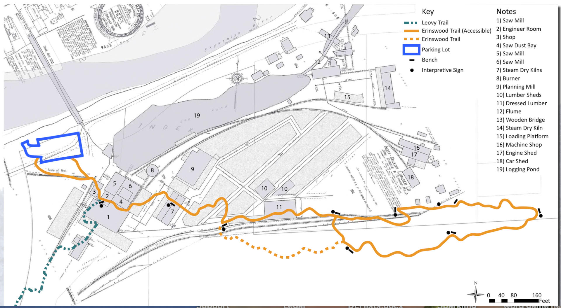 HRCP's current and planned trails, parking lot, benches and interpretive signs overlaid onto 1917 historic footprint of the Index-Galena Lumber Company.